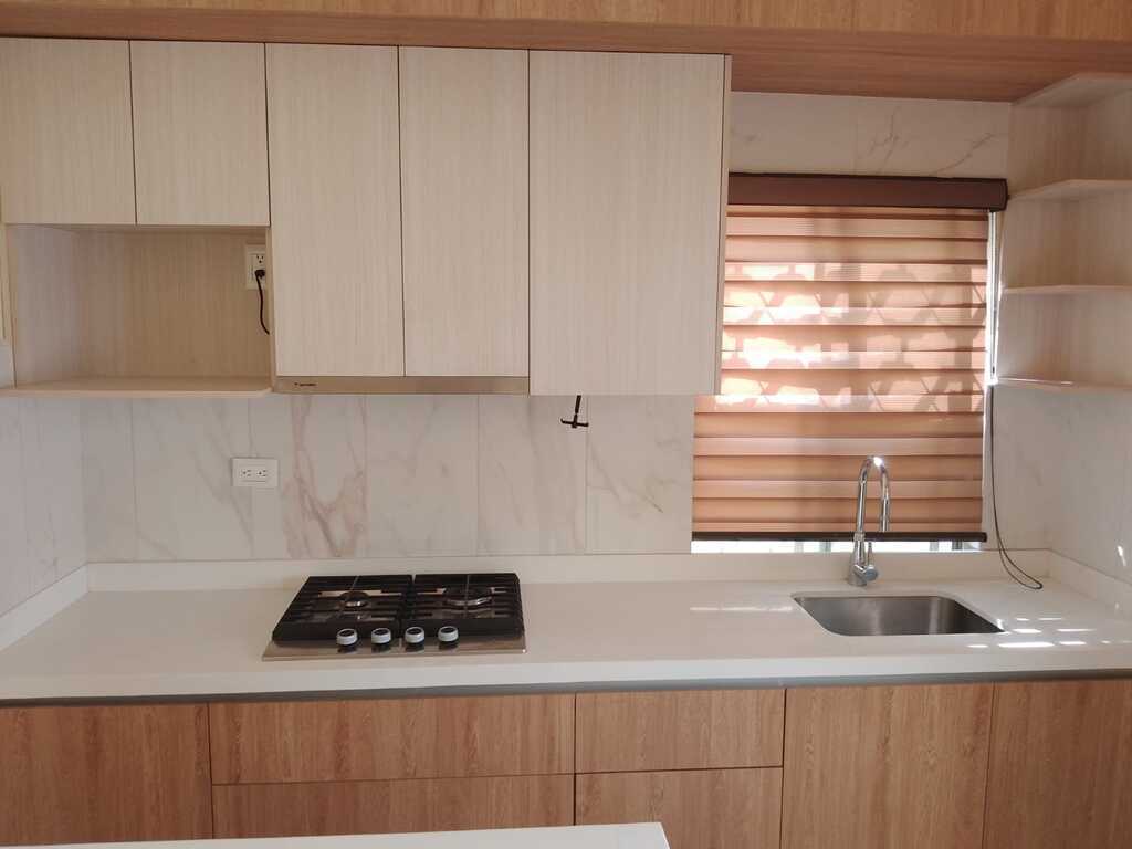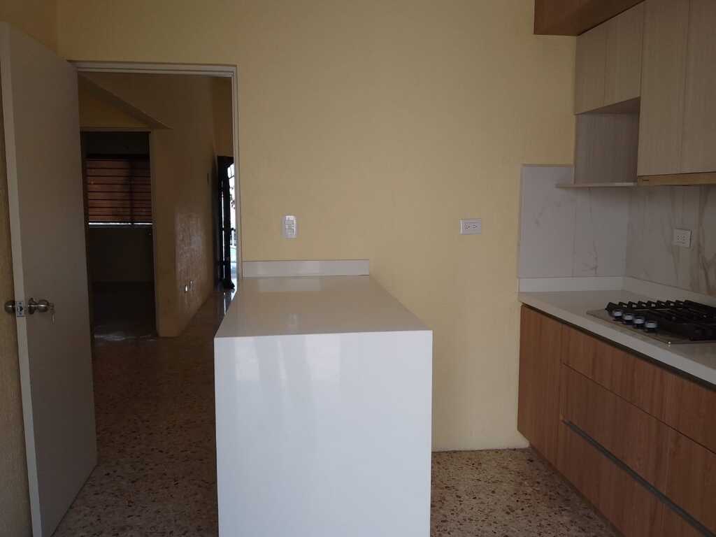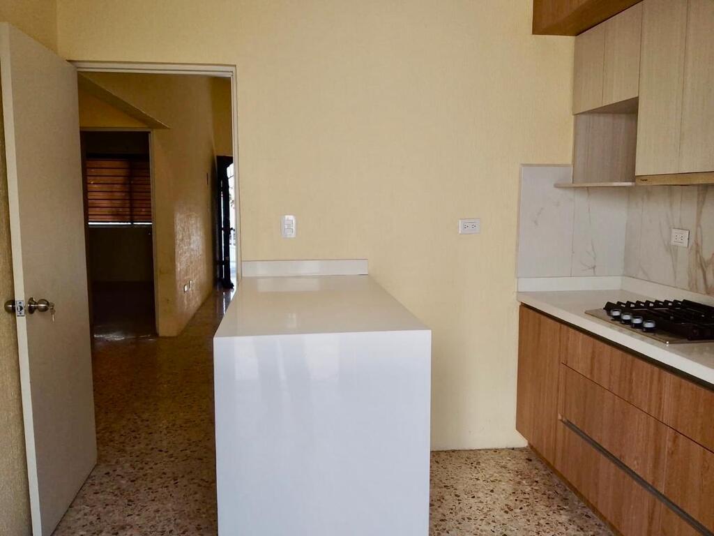 Sala, comedor, cocina recién remodelada.